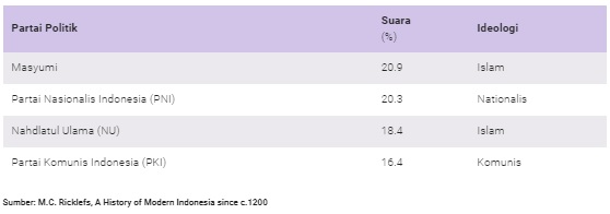 Demokrasi parlementer di Indonesia pada tahun 1950an ditandai oleh ketidakstabilan. Alasan utamanya adalah perbedaan sudut pandang mengenai dasar ideologis negara. Situasi ini terlihat dalam pemilihan umum pertama di Indonesia. Pemilihan umum pertama ini terjadi pada tahun 1955 dan dianggap jujur dan adil (dan akan membutuhkan waktu lebih dari 40 tahun sebelum Indonesia bisa memiliki contoh lain dari pemilu yang jujur dan adil). Dua partai Islam yang besar yaitu Masyumi dan Nahdlatul Ulama, atau NU (Nahdatul Ulama telah memisahkan diri dari Masyumi pada tahun 1952) mendapatkan masing-masing 20,9% dan 18,4% suara. PNI meraih 20,3% suara, sementara PKI meraih 16,4%. Ini berarti tidak ada mayoritas satu partai yang bisa menguasai pemerintahan sehingga kabinet di masa parlementer dibentuk dengan membangun koalisi-koalisi antara berbagai aliran ideologi. Dari 1950 sampai 1959, tujuh kabinet yang memerintah berganti-ganti secara cepat, dan setiap kabinet gagal membuat perubahan yang signifikan untuk negara.